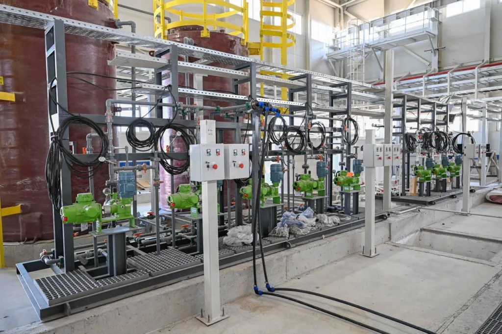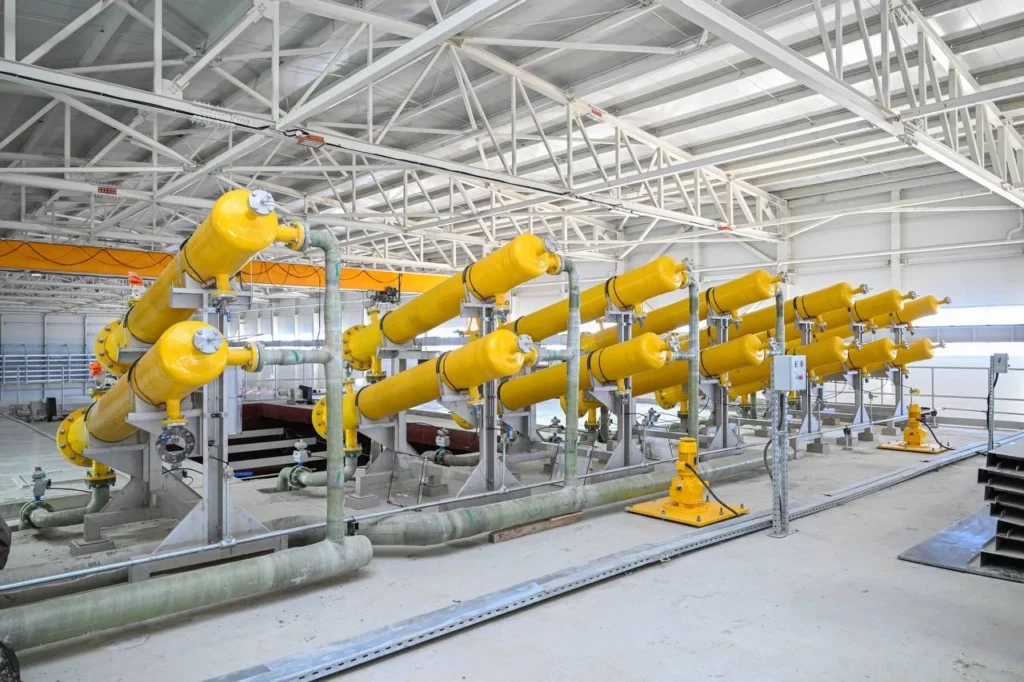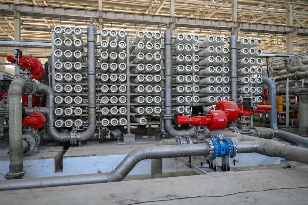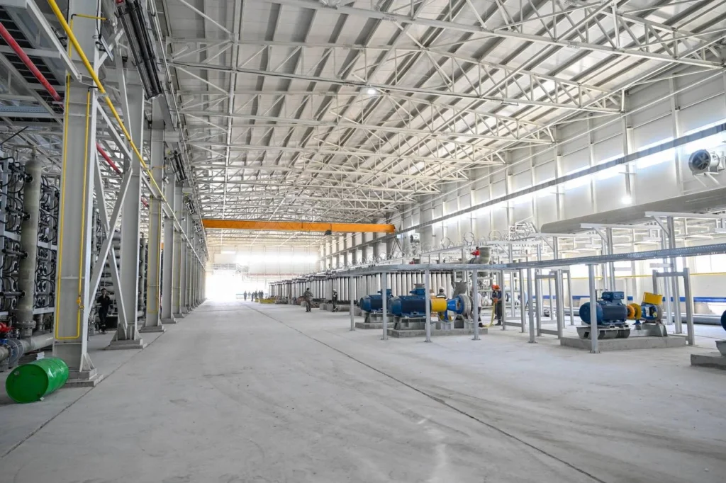 Отметим, 30 мая на предприятии были завершены строительные работы. Построены цеха по опреснению, обессоливанию и минерализации воды, насосная станция, две подстанции, ремонтно-механический цех, гараж, склады, лаборатория, пожарный пост, котельная, а также инженерно-коммуникационная инфраструктура — линия электропередач — 80,1 км, магистральный водовод — 2 нитки общей протяженностью 201,4 км, газопровод — 48,1 км, автодорога — 40,1 км. По морской части проекта проведена укладка в траншею на дно моря полиэтиленовых труб. На предприятии используются новейшие разработки ведущих мировых производителей.